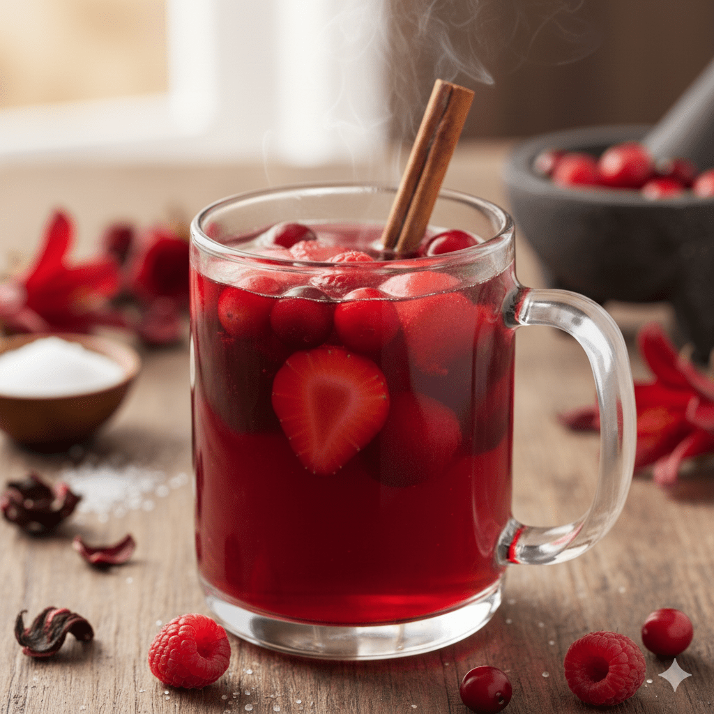 Ponche tibio navideño de flor de jamaica y frutos rojos.